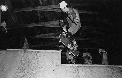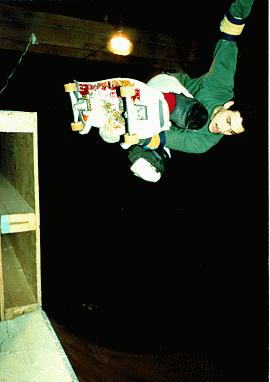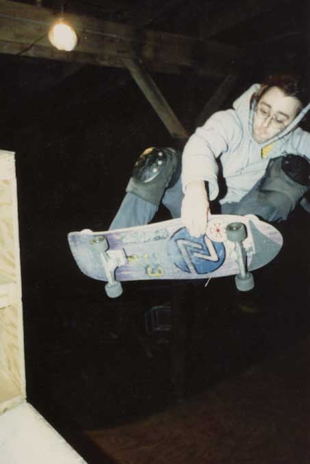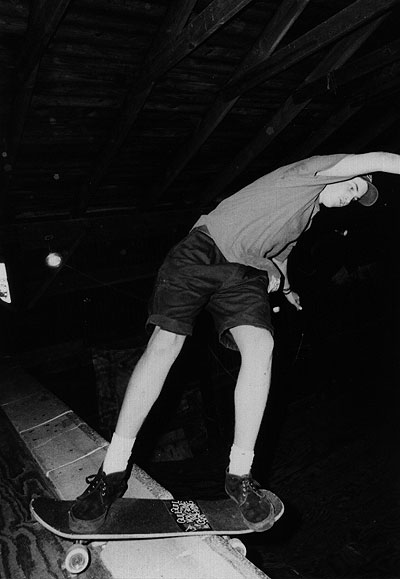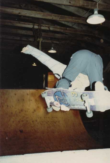 Living out on a farm in the country gave me a rare opprotunity to have an indoor ramp. Here was the deal. There was several barns and large buildings on this property. Most were being used for various farm activities. There was one building that wasn't usable for farming but made an excellent place to host a half pipe. The building had collasped at one end and most of the roof was gone or had huge holes in it. We started fixing the holes in the area we planned to build the ramp but there were to many to deal with. So we ended up hanging a huge tarp, up next to the ceiling and at an angle so any water that did fall through the holes would just run off to one side. It sounds cheesy but it actually worked pretty well. The ramp was 24' wide and had 12' of flatspace, made with 10' transitions but only 8' tall. The whole ramp was coped with cement pool coping. That was the one big thing that made our ramp fucking awesome. REAL grinds on REAL pool coping were rare in Michigan. On one corner was a severe vertical extension that was 4' tall and 8' wide. Pure vert. We took a sheet of plywood and built a heavy frame for it and attached it to the deck. It was cool to thurst up onto the extention then use that speed to blast moves on the other side. At one time there was a cement curb on top of it. Now THAT was a bitch to get up there! Doing curb tricks were hectic! due to being way up in the ceiling rafters of the building. I could frontside grind the curb. Brian Mank did lien to tail and fakie rocks on it. The extention was also very fun to blast airs off of.