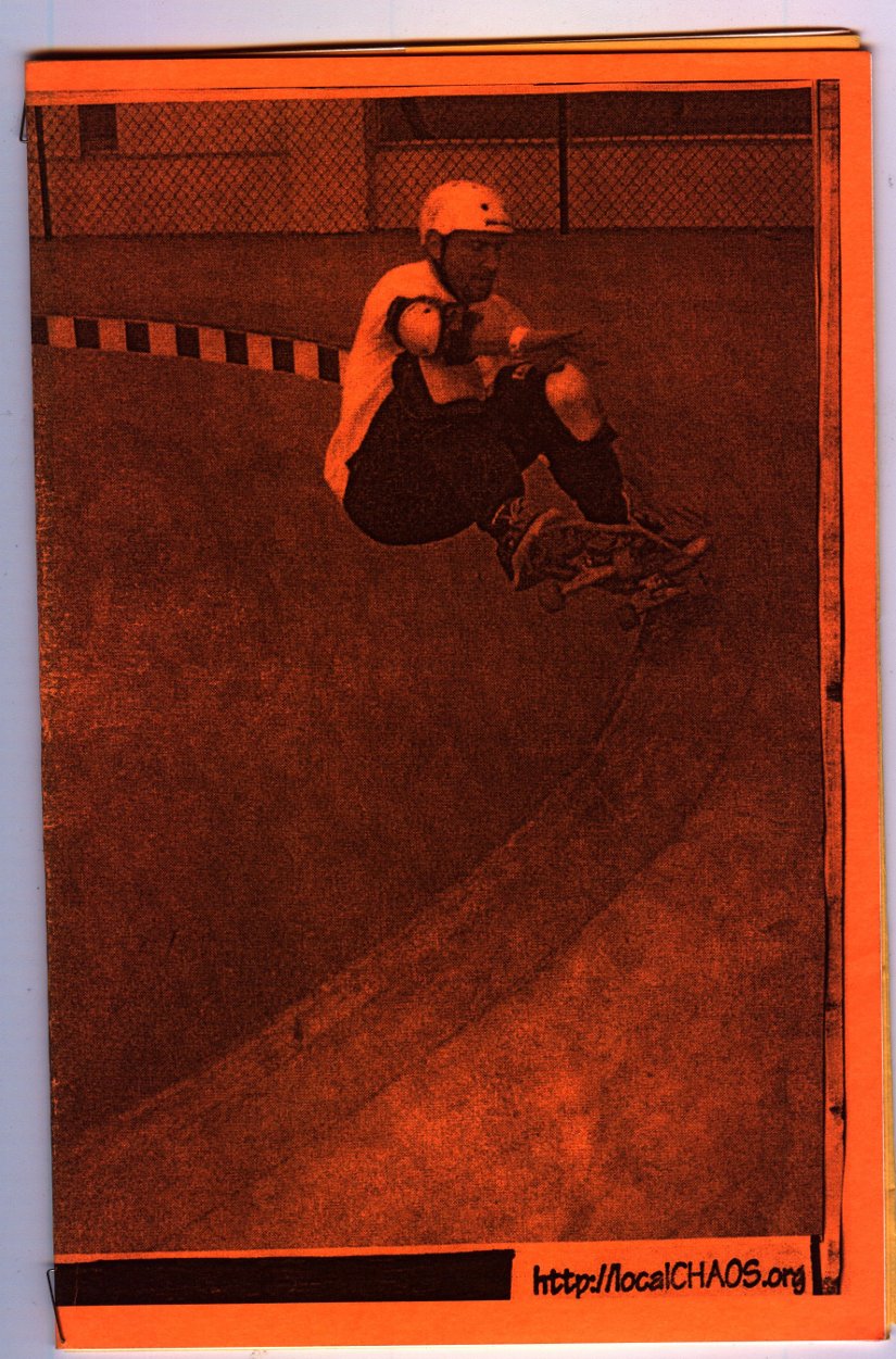 LocalCHAOS, the skate zine, could have never happened if it were not for all my bros I skated with back in the day. Mike Bush, Tony Custodio, David Tuck(RIP), Jeff Martin, Todd Philipps(RIP), Rick Osbourne, Trevor Staples, Martin Friedman(RIP), Adam Graham, Lee Jackson, Tommy Hartwell, Derick and Davy Robbins, Mark Hildinger, Rob Dahl(RIP), Ken Nelson, Chris Becker, Kip Griffin, Jon Wright, Kevin Ryberg(RIP), Marc Conahan (Body Slam 'zine), Poacher, Phil (cool roller skater dude), Mint, Al Carter(RIP)(Rebel Ramp - Georgetown, S.C.), Rick Tertel, Kyle MacDonald, Andy MacDonald and my very special bro of bros...Jeff Hadley(RIP) - Keeper of our Vert Ramp and provider of MANY MANY very cool memories. To you Jeff, I raise my 40 and toast.