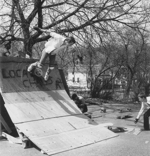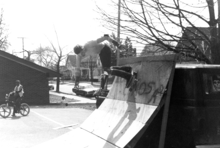 One of OUR first ramps was what ended up being called the "Chaos Quarter". Tommy and I took that quarter pipe that was stored behind my parents house and figured out an easy way to transport it with my van. When you looked at the side view of the ramp, it kinda sorta looked like a right angle triangle. We thought "Hmmm..." if the ramp was split vertically up the middle, then the two halfs could be flipped to form a "box" which would then slide right into the back of my '66 Ford van. It was easy enough to then bolt the two halfs back together and quickly nail down a top layer of plywood to ride on. Leaning the ramp againest the van gave it good solid support. Now that we had a ramp and a way to get it around, we needed a place to set it up. Well.. right across the street from the Truth House was a nice sloping parking lot that was perfect!. Since we only set it up on weekends, the business who owned the parking lot was never bothered by it. Obviously, this was way before the country/society became all fucked up with it's STUPID "litigation" way of thinking. I cant remember how many times we sat that quarter up, but I do remember it was several weekends in a row.The crowd of kids that came over to give it a try was awesome! .. It was NOT uncommon for as many as 30 or more kids there at any given time. All learning to kickturn. We were beginners at that time and a sucessful kickturn was a big deal. If you got a wheeler or did a grind across the top.. then you were "hot shit" for the day.